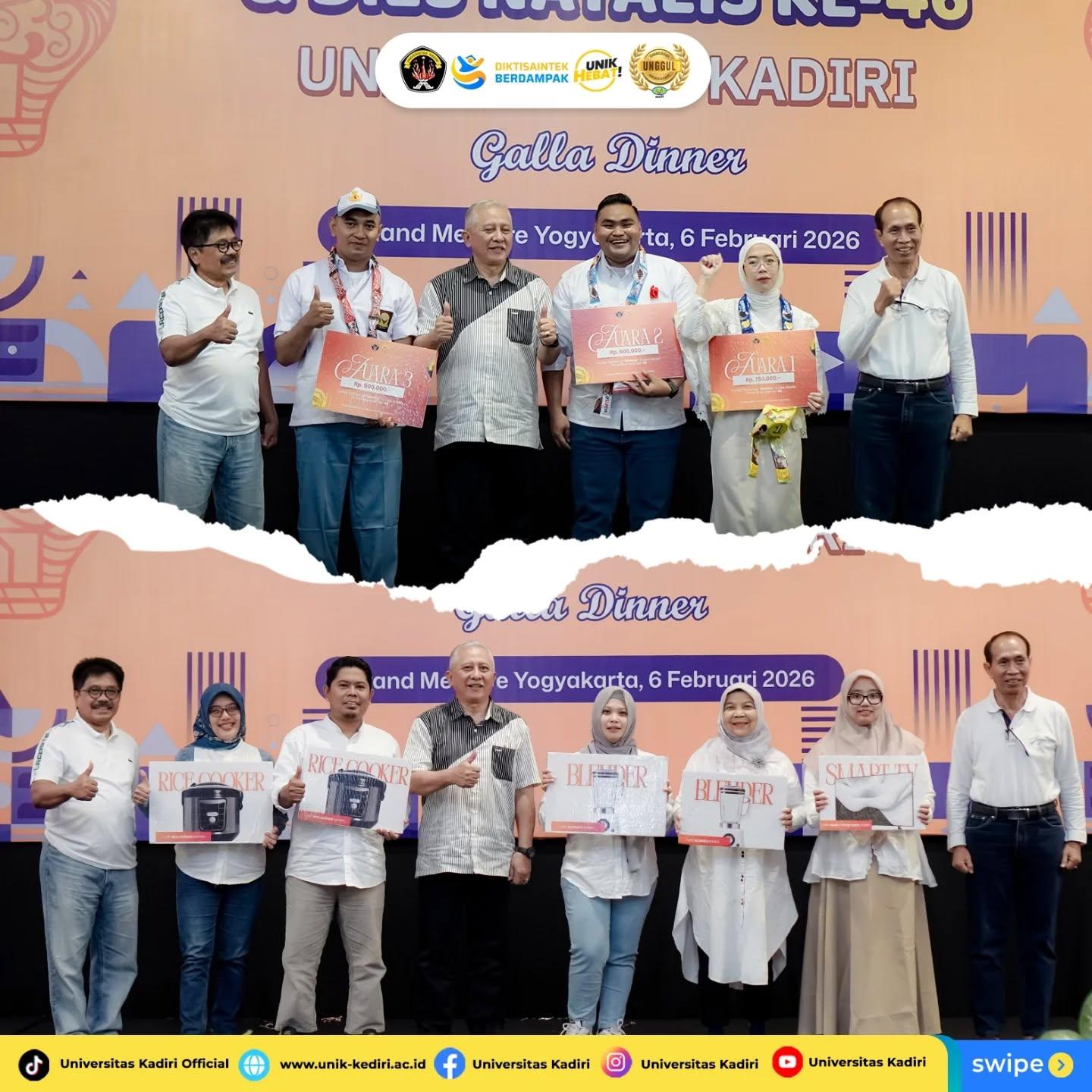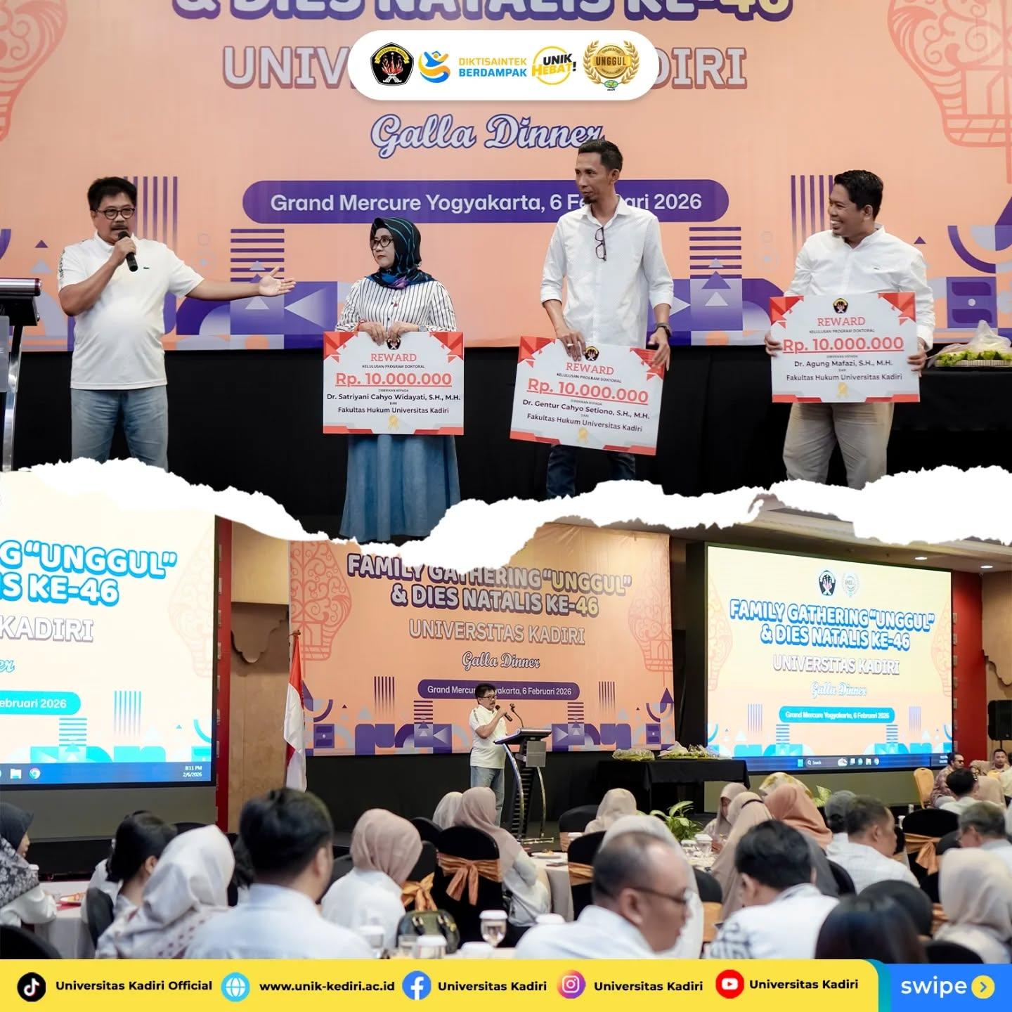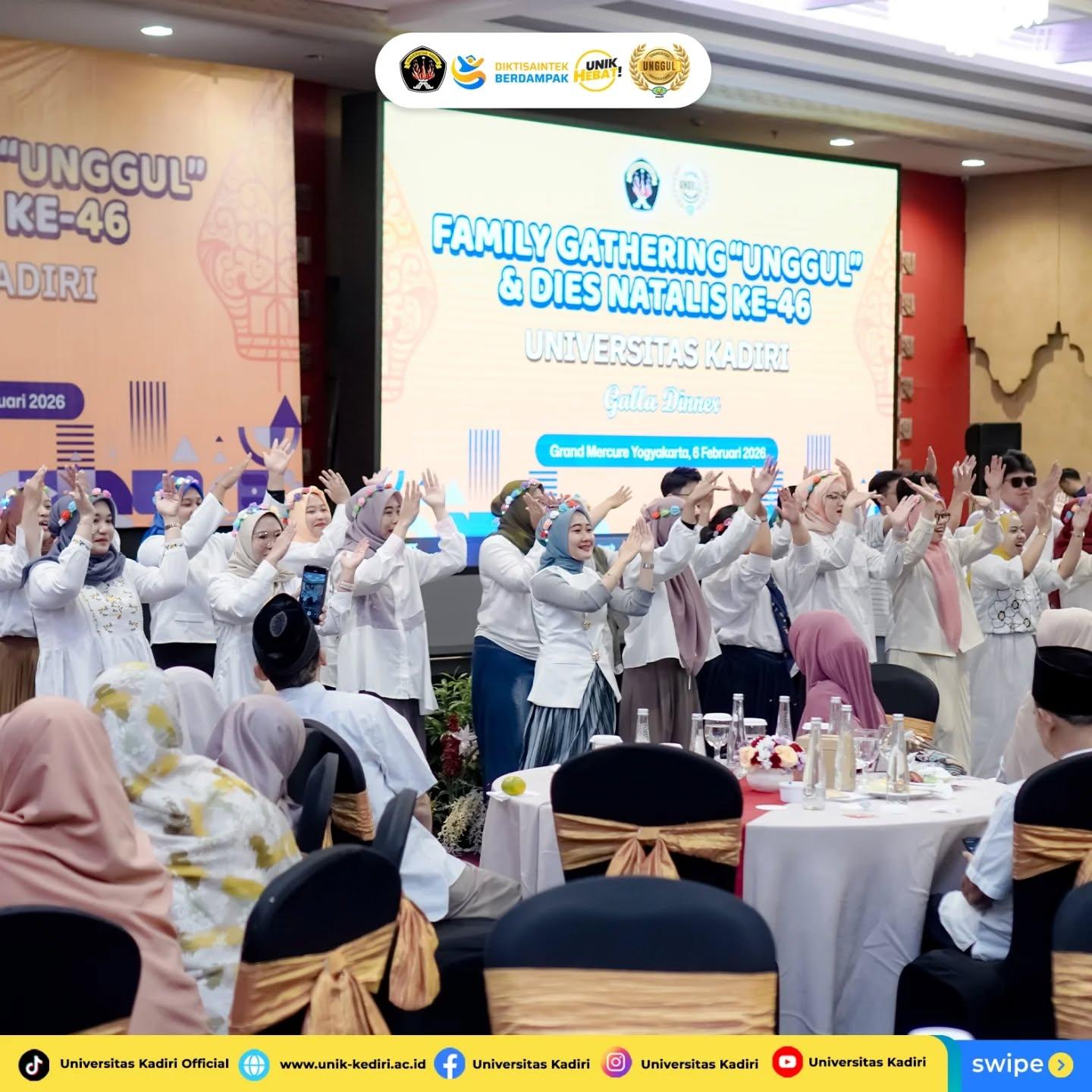 Universitas Kadiri menyelenggarakan kegiatan Family Gathering “Unggul” & Dies Natalis ke-46 pada Kamis, 6 Februari 2026 bertempat di Grand Mercure Yogyakarta. Kegiatan ini menjadi rangkaian tasyakuran atas capaian predikat Akreditasi Institusi “Unggul” sekaligus peringatan Dies Natalis Universitas Kadiri ke-46, yang diikuti oleh sivitas akademika dalam suasana hangat, penuh kebersamaan, dan sarat makna.