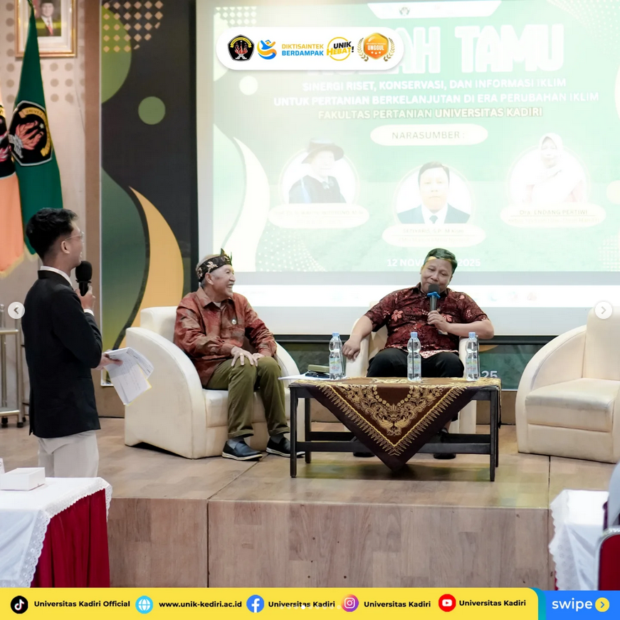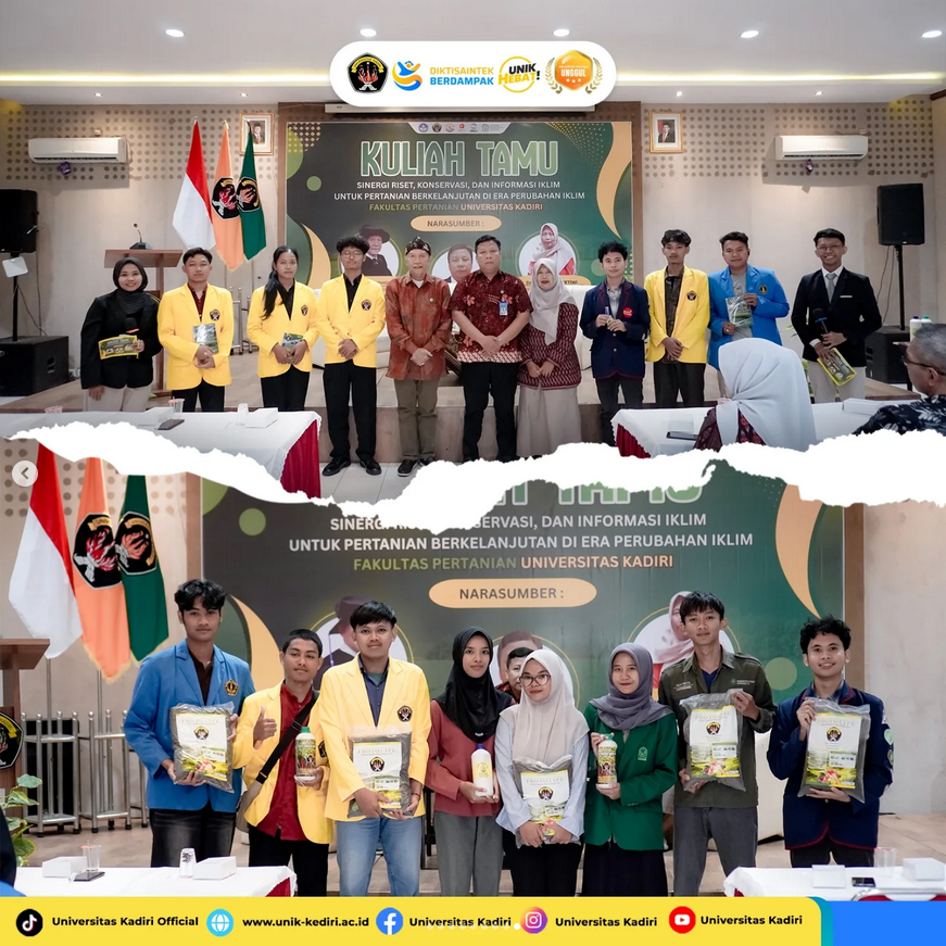 Fakultas Pertanian Universitas Kadiri menyelenggarakan Kuliah Tamu dengan tema “Sinergi Riset, Konservasi, dan Informasi Iklim untuk Pertanian Berkelanjutan di Era Perubahan Iklim” pada Rabu, 12 November 2025. Kegiatan yang berlangsung mulai pukul 08.00 WIB sampai selesai ini dilaksanakan di Aula B105, Gedung B Universitas Kadiri, dan diikuti dengan antusias oleh sivitas akademika serta undangan dari berbagai perguruan tinggi di Kota dan Kabupaten Kediri.