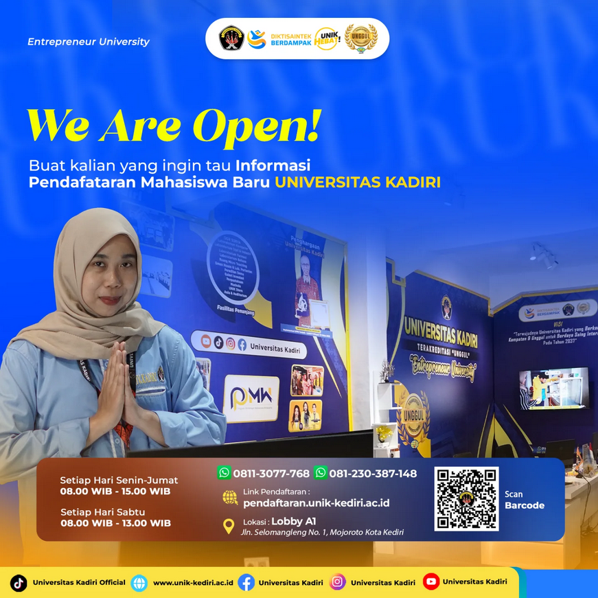 Untuk memberikan kemudahan akses informasi bagi calon mahasiswa dan masyarakat, Universitas Kadiri membuka layanan informasi pendaftaran melalui berbagai kanal berikut: