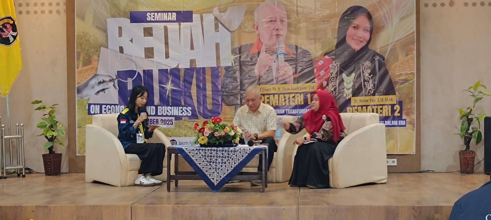 Fakultas Ekonomi dan Bisnis Universitas Kadiri menyelenggarakan Seminar Bedah Buku On Economic and Business sebagai ruang ilmiah untuk mendalami dinamika ekonomi dan bisnis kontemporer. Kegiatan yang berlangsung di Aula B105 Universitas Kadiri ini dihadiri oleh mahasiswa, dosen, dan undangan, serta menjadi medium vital untuk menganalisis secara kritis teori sekaligus praktik terbaik dalam pengelolaan ekonomi dan bisnis modern.