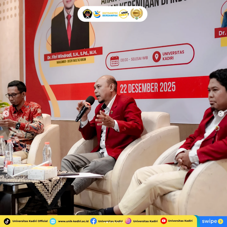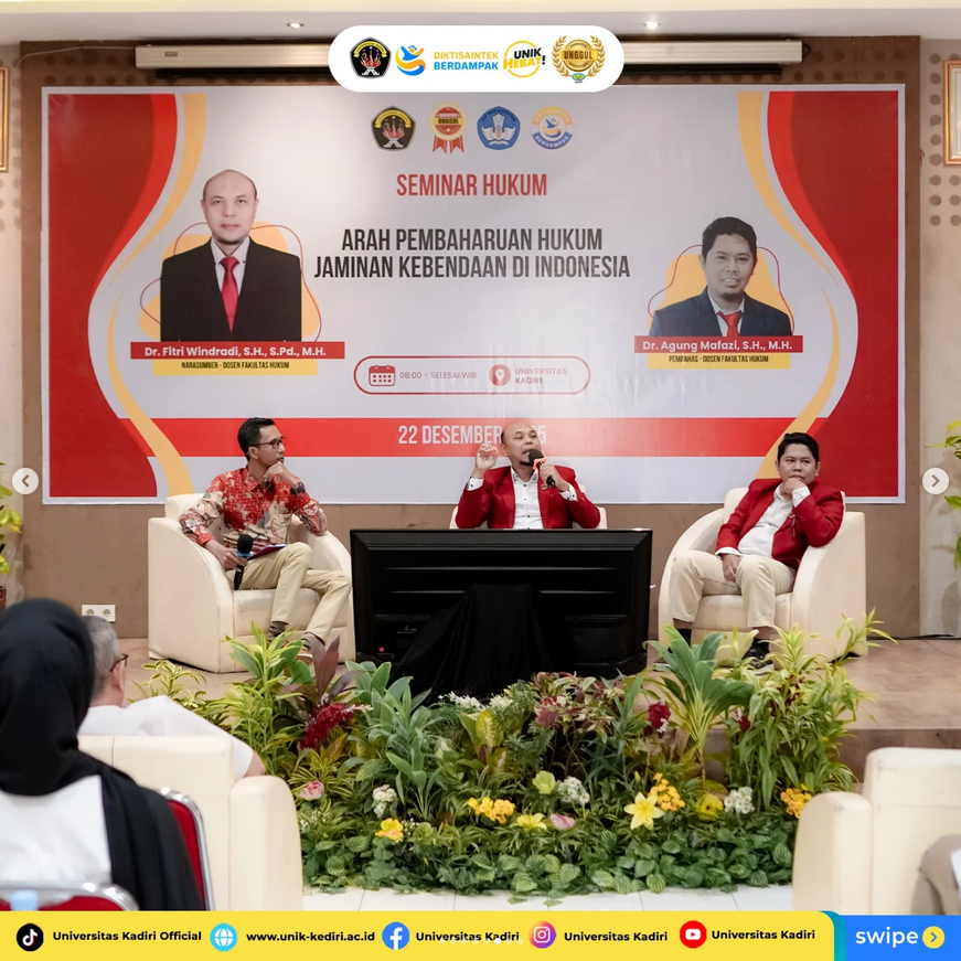 Fakultas Hukum Universitas Kadiri kembali menyelenggarakan kegiatan ilmiah sebagai bentuk komitmen dalam pengembangan ilmu hukum dan peningkatan kualitas akademik. Pada Senin, 22 Desember 2025, bertempat di Aula Universitas Kadiri, telah berlangsung Seminar Hukum bertajuk “Arah Pembaharuan Hukum Jaminan Kebendaan di Indonesia”. Kegiatan ini diikuti dengan antusias oleh dosen, mahasiswa, serta tamu undangan dari berbagai kalangan.