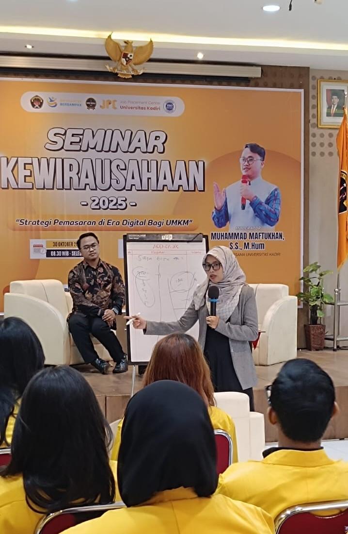 Kediri, 30 Oktober 2025 — Dalam rangka mendukung penguatan ekosistem kewirausahaan di lingkungan kampus, Unit Karir Job Placement Center (JPC) Universitas Kadiri bekerja sama dengan PT Rahma Riyadi Techno sukses menyelenggarakan kegiatan Seminar Kewirausahaan 2025 dengan tema “Strategi Pemasaran di Era Digital bagi UMKM.”