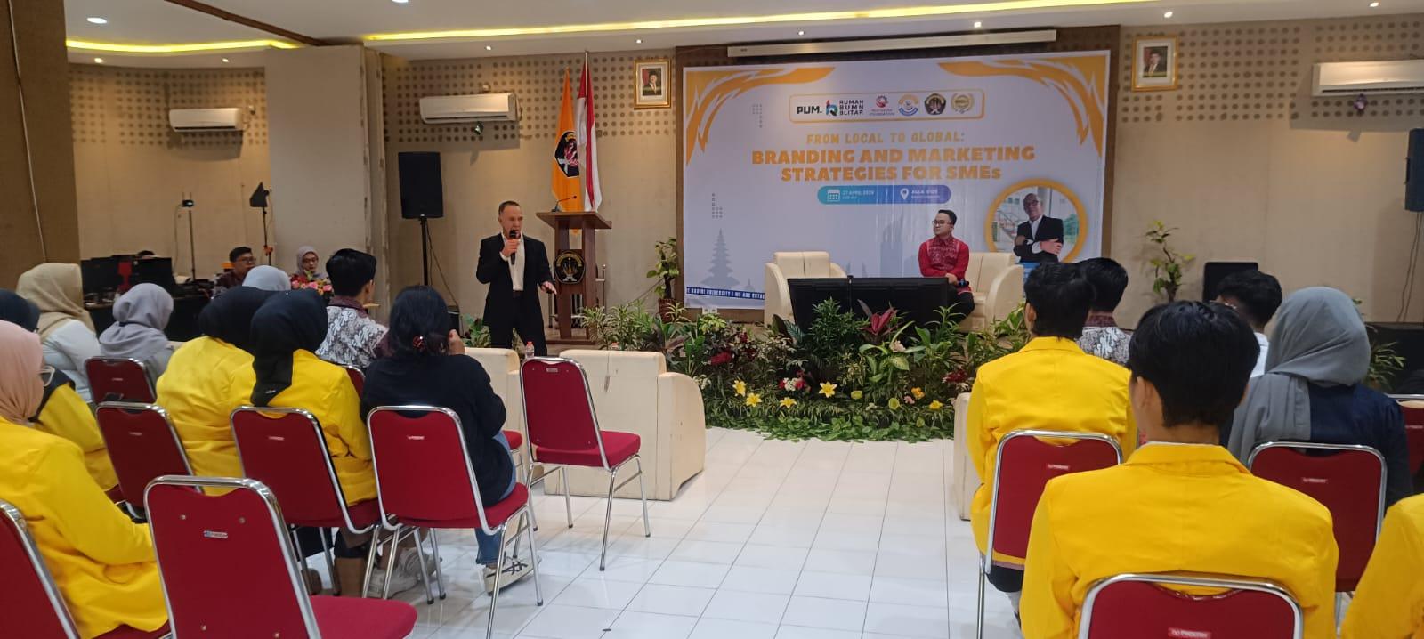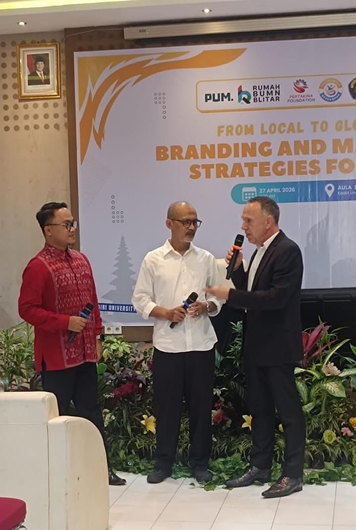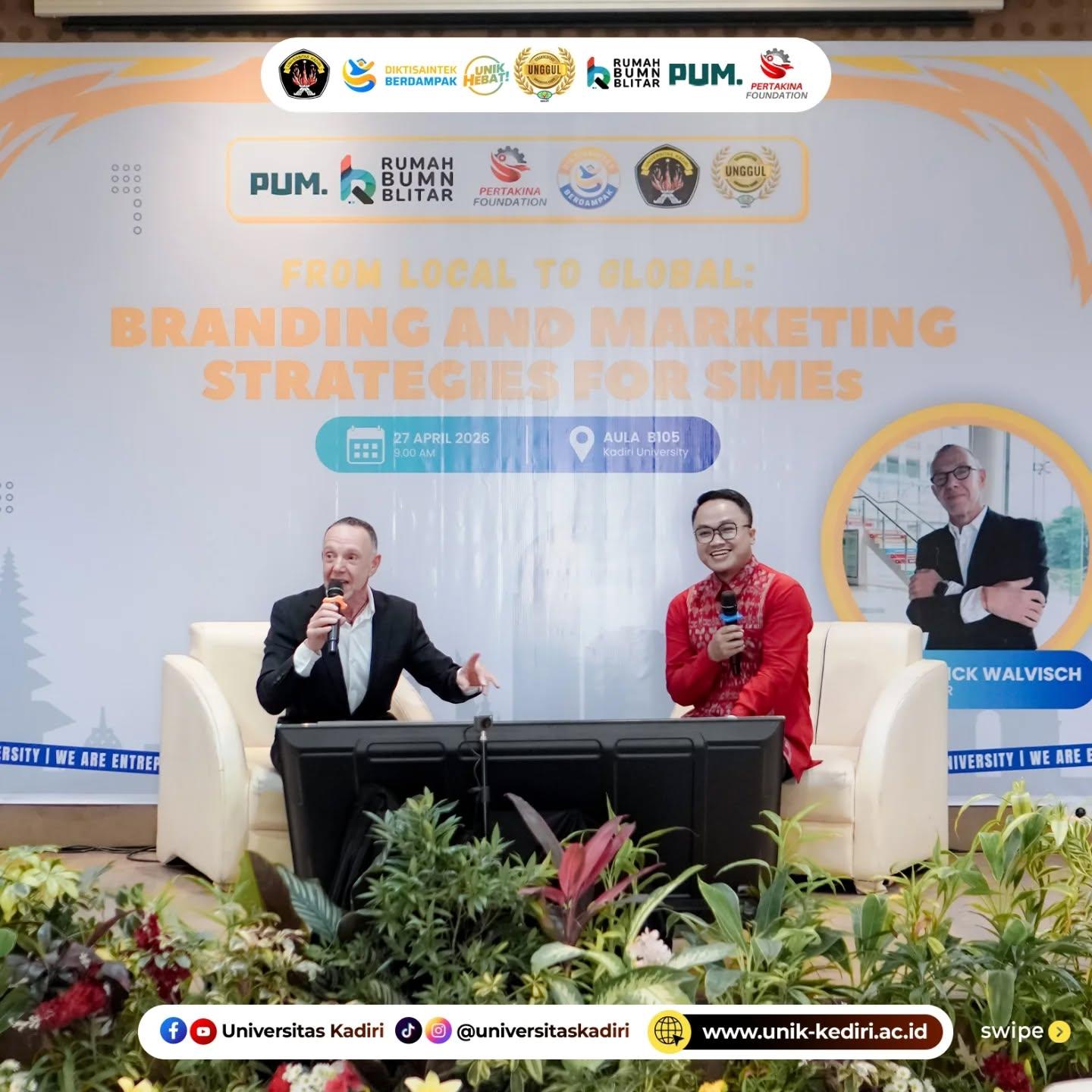 Universitas Kadiri menyelenggarakan seminar bertajuk “From Local to Global: Branding and Marketing Strategies for SMEs” pada Senin, 27 April 2026 pukul 09.00 WIB bertempat di Aula B1-05 Universitas Kadiri. Kegiatan ini dilaksanakan secara luring dan daring, sebagai bentuk komitmen kampus dalam memperkuat literasi kewirausahaan, pengembangan UMKM, serta peningkatan kompetensi mahasiswa menghadapi dinamika ekonomi global.